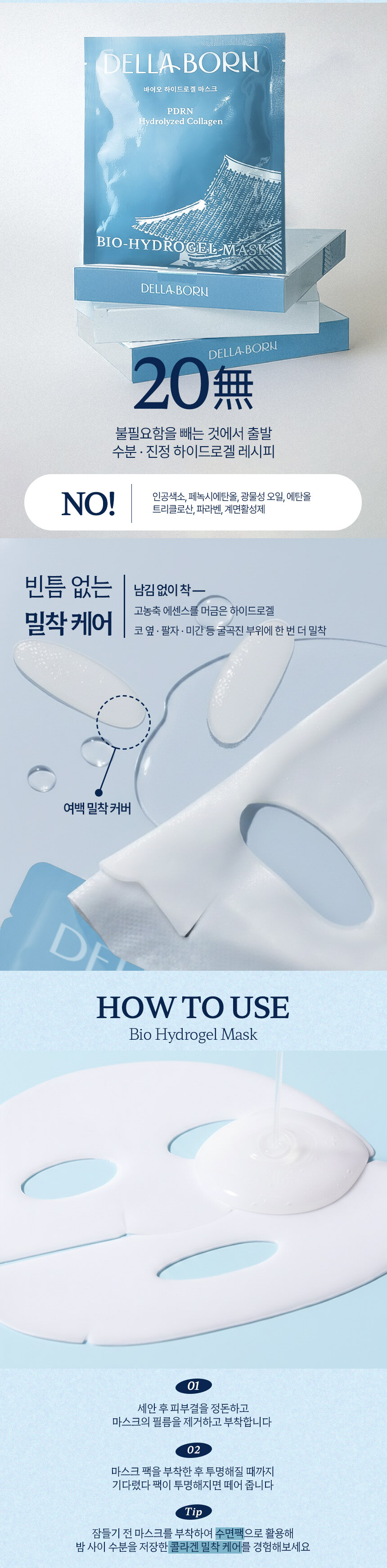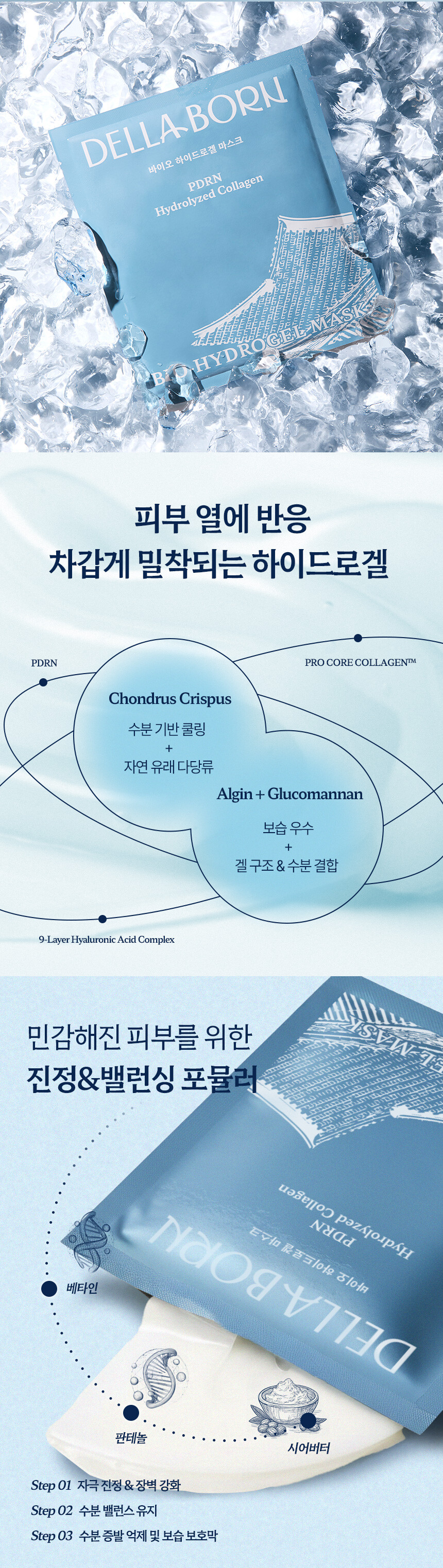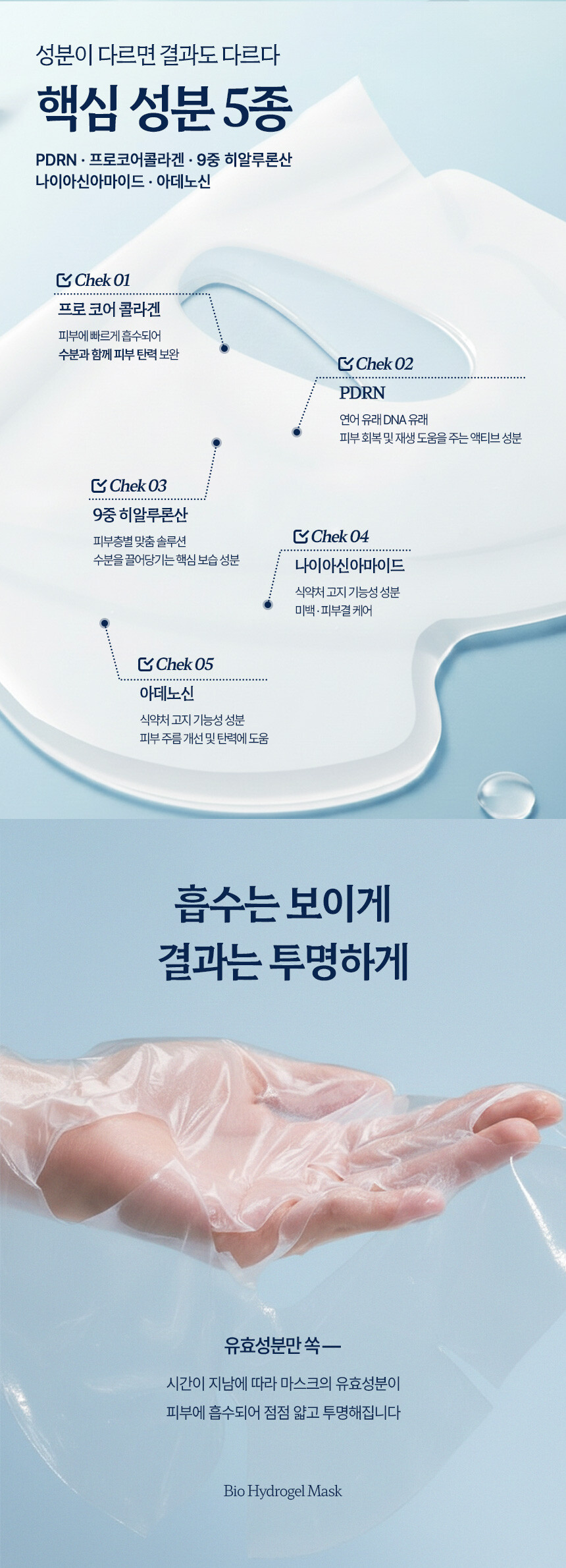 피부 깊은 곳까지 흡수되는 300Da 저분자 콜라겐과 다양한 크기의 히알루론산과 연어PDRN 성분이 함유된 수분탄력 마스크.